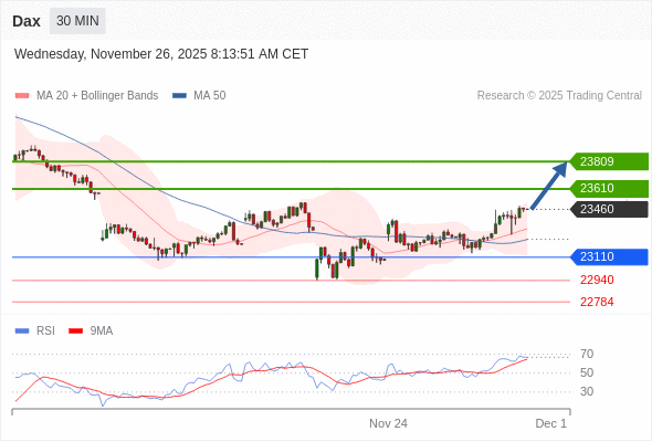 在 23110 之上,看涨,目标价位为 23610 ,然后为 23809 。